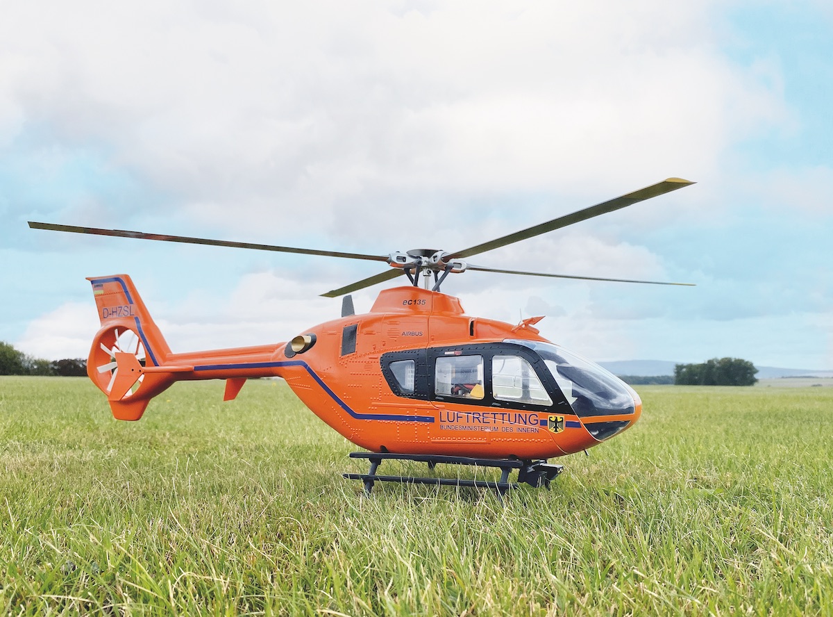 Seit einigen Jahren dachte Alexander von Ascheberg bereits über ein EC 135-Modell in der orangenen Lackierung des Bundesministeriums des Innern nach. Bei der Betrachtung zahlreicher Videos im Netz lag sein Fokus stets auf einer möglichen Umsetzung dieses Vorhabens. Durch Zufall stieß er dann auf ein Video aus den USA, in dem jemand den Rumpf teilweise umlackiert hatte. Da war klar: Das kann er auch.